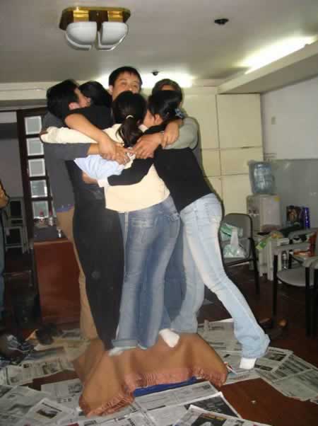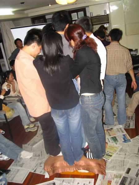 “抱團(tuán)打天下”游戲:7人合力站在小小的啤酒箱上,堅持1分鐘以上才算過關(guān)。此游戲可以訓(xùn)練團(tuán)隊合作精神,考驗意志力和增強(qiáng)組員的相互協(xié)調(diào)與團(tuán)結(jié)能力。