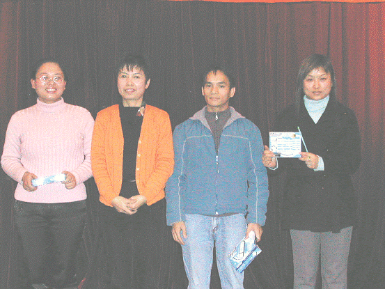 門市經(jīng)理王穎輝為獲得三等獎(jiǎng)的三位同事頒發(fā)獎(jiǎng)品并留影