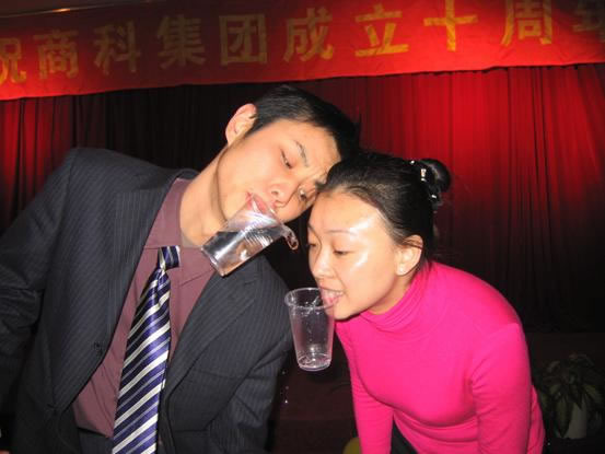 《細(xì)水長(zhǎng)流》5人/組*2組:每人嘴上含一只杯子,第一人杯中倒?jié)M水,依次將杯中的水倒入下一人杯中,不許用手腳,最快并杯中水最多者為勝