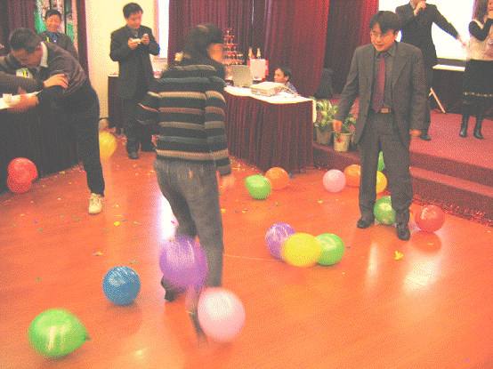 《踩氣球》2人/組*4組:每人左右腳上各綁四個(gè)氣球,互相踩對(duì)手的氣球,最后以破得最少者為勝。對(duì)手們是虎視眈眈,瞄準(zhǔn)目標(biāo)就上。