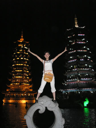 桂林兩江四湖的夜景確實(shí)醉人,瞧這MM得意的在榕湖畔撐起金銀雙塔。