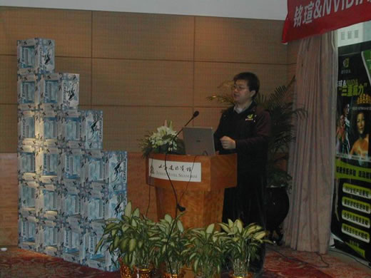 隨著銘瑄&NVIDIA全國經(jīng)銷商會的召開,大家對NVIDIA中國區(qū)渠道經(jīng)理侯宇濤先生已經(jīng)非常熟悉,侯先生就NVIDIA的產(chǎn)品情況給大家做了詳細的培訓(xùn),在前幾次培訓(xùn)三重威力的基礎(chǔ)上,這次還重點強調(diào)了2006年NVIDIA即將推出的G70系列顯卡及先進的Purevideo視頻技術(shù)。