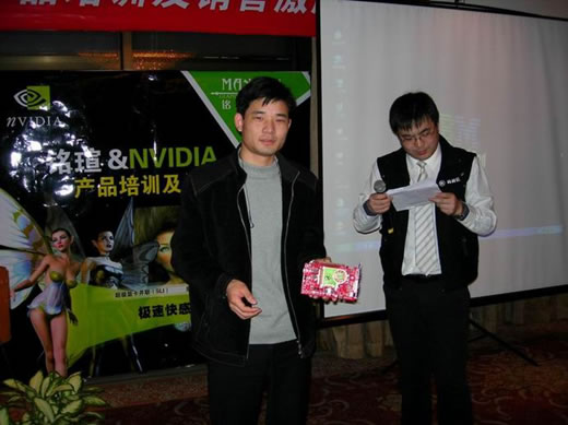 這次經(jīng)銷商會的互動活動也是相當成功,抽獎、有獎問答及現(xiàn)場拍賣一系列活動使得現(xiàn)場氣氛十分熱烈。幸運的經(jīng)銷商抽得銘瑄極光系列顯卡一張。NVIDIA侯宇濤先生為其頒獎。