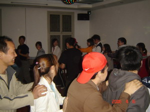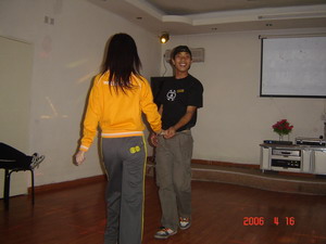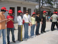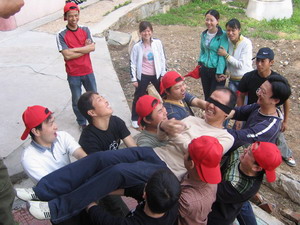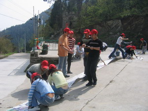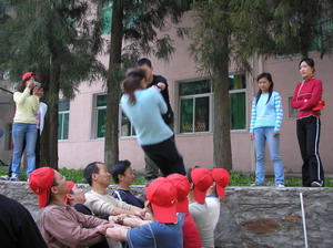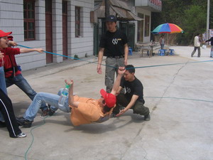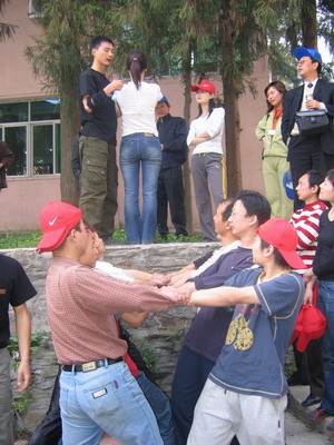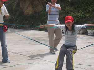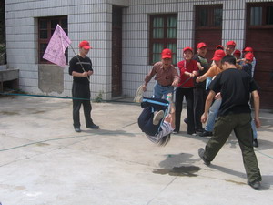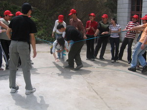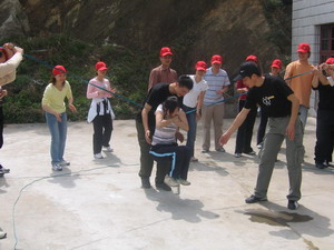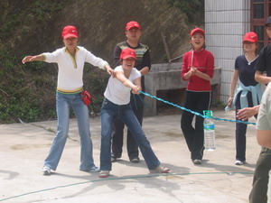 雷陣取水(在一個直徑4米的地面中間有一個裝滿水的杯子(作為假設(shè)的地雷),我們有的工具就是繩子和人,并且繩子和人都不能接觸圈內(nèi)的地面的情況下取出杯子,而且滴水不能灑。想一想可能嗎?當(dāng)然可以,團(tuán)隊的智慧和潛力是不可估量的。我們在5分鐘的時間里做出了8種方案,利害吧:)