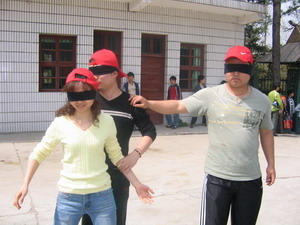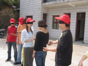 盲人摸號(每隊選出9個成員均戴上眼罩,每人一個號,此號只有本人知道。小組成員在“全盲全啞”狀態(tài)下,根據(jù)每人的號數(shù),按從小到大的順序排列出一條直線。全盲全啞?那怎么溝通呀?聽起來有點(diǎn)兒難度哦,但武漢商科人果然聰明,雖然中間出了一點(diǎn)兒小差曲(有人差點(diǎn)兒偏離隊伍),但兩個隊均在7分鐘和8分鐘內(nèi)準(zhǔn)確的排列出順序,是一點(diǎn)兒不差哦。教官都說我們的成績是相當(dāng)不錯呀。唉,不得不佩服我們自己呀。^-^)