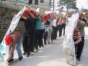 鐵甲戰(zhàn)車(記得坦克是怎么前行的嗎?軸帶動履帶向前進(jìn)。教官“丟”給我們每個隊一小疊報紙和一小圈透明膠。有限的資源,50米的距離,報紙為“履帶”,人為“滾軸”, 我們要前行啦!)