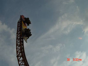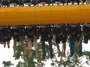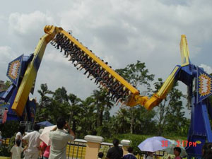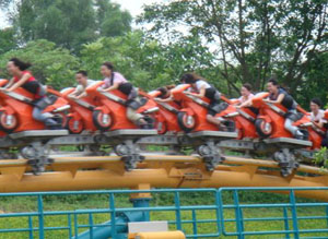 十環(huán)過山車 最聲名顯赫的游戲,亞洲首臺、全世界第二臺(僅在英國有一臺)、單項設(shè)備投資超過人民幣一億元,打破游樂設(shè)備環(huán)數(shù)最多的世界記錄,并創(chuàng)造了世界吉尼斯記錄。