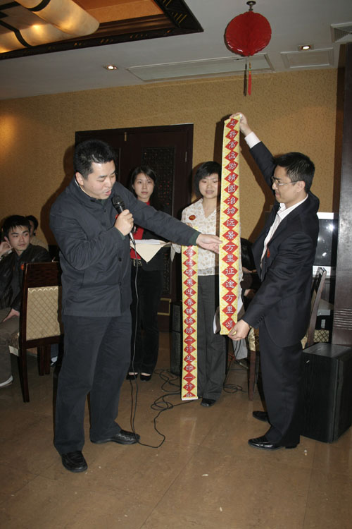 表彰大會(huì)結(jié)束后,進(jìn)入了豬年迎春晚會(huì)的階段,首先進(jìn)行了傳統(tǒng)風(fēng)味濃郁的對聯(lián)節(jié)目。