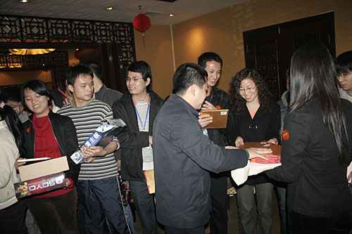 之后,晚會(huì)進(jìn)行了一個(gè)特別的節(jié)目,主持人邀請全體屬相是豬的同仁上臺(tái),領(lǐng)取一份特別的祝福和禮物。商科劉總宣布:“這將成為商科的每年的一個(gè)慣例,希望同事們能夠拿到第三個(gè)、第四個(gè)這樣的禮物。”
