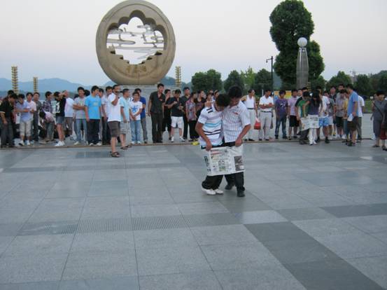 “兩人一腳”,一邊賣(mài)力的向前進(jìn),一邊還要保護(hù)報(bào)紙不能有破損。瞧這“兩兄弟”感情多好,不斷引來(lái)陣陣笑聲。