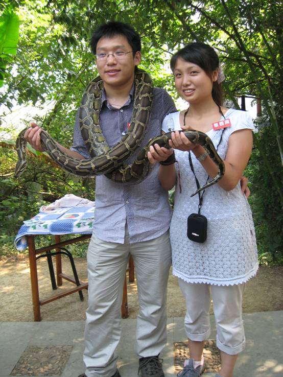 來(lái)蛇島當(dāng)然要和蛇島的主角合影嘍!瞧我們的美女和帥哥,摟著大蟒蛇一點(diǎn)也不怕。