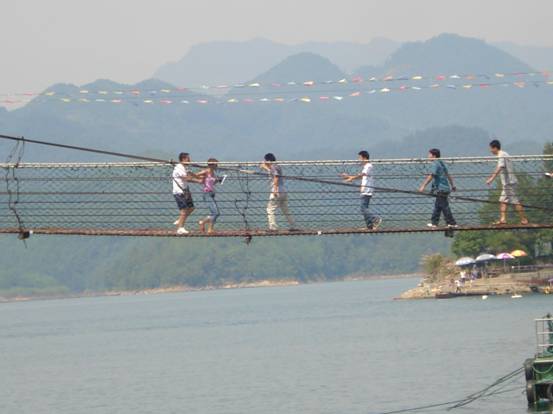 我們面向大山,腳下臨水,感受水天一色的自然風(fēng)光,體驗(yàn)“狀元橋”帶來(lái)的驚險(xiǎn)。連我們上分最瘦弱的女生都不甘示弱,要來(lái)體驗(yàn)一把。
