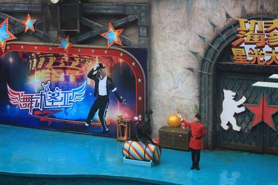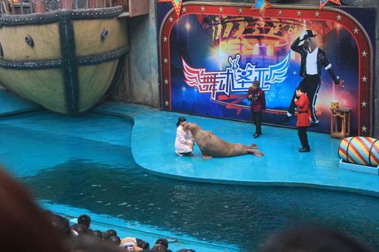先是海獅表演,接下來是海象表演有熱身運(yùn)動仰臥起坐,接著模仿MJ,重頭戲調(diào)戲美女