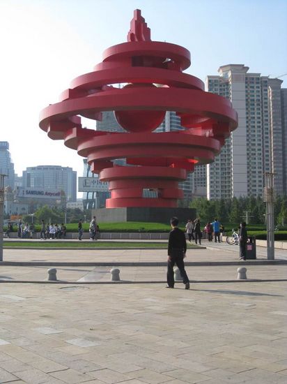 標(biāo)志性雕塑“五月的風(fēng)”,以螺旋上升的風(fēng)的造型和火紅的色彩,充分體現(xiàn)了“五四運(yùn)動”反帝、反封建的愛國主義基調(diào)和張揚(yáng)騰升的民族力量。