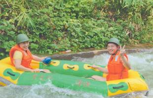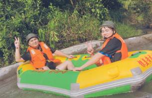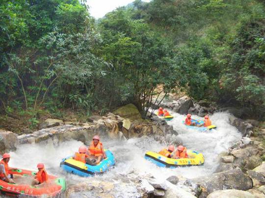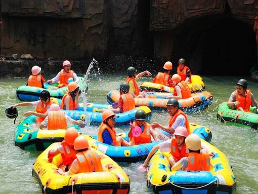 漂流河道設(shè)計者,巧奪天工,河道順山勢無盡曲折旋回,漂流舟高高躍起,左右回旋,扎入水中,又高高躍起,又高低回旋扎入水中……讓漂流者充分享受竄上云霄,極速墜地的刺激有驚無大險!不過感覺最爽最刺激還是中游處的黑隧道電閃漂!
