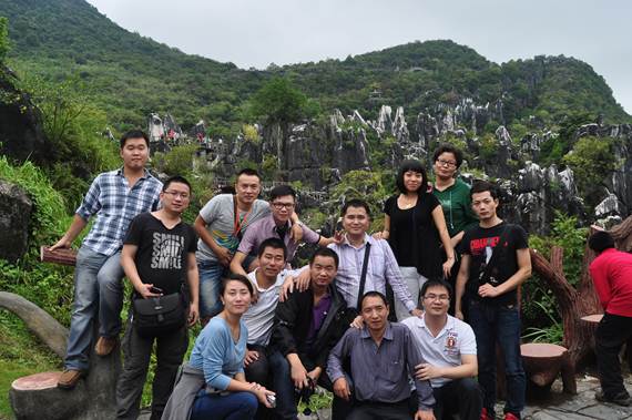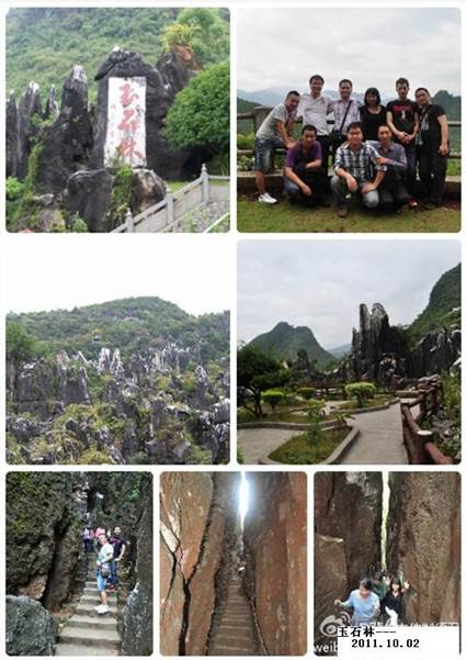當(dāng)天下午三點(diǎn)多我們又來(lái)到玉石林景區(qū),它之所以叫玉石林是因?yàn)樯缴系氖^屬于玉白色,不同于昆明的花崗巖石林;一路行去,處處石林矗立、石芽裸露、奇峰突兀、石筍石柱狹縫密布;玉石林的小路涉及很科學(xué),在不大的景區(qū)蜿蜒穿插,交錯(cuò)疊行,可以使游人充分運(yùn)動(dòng),又能從不同角度去欣賞玉石林的特色;大家逢路必走,有坡必上,特別是在“一線(xiàn)天”,累的大汗淋漓,較上午的游姑婆山累多了。。。