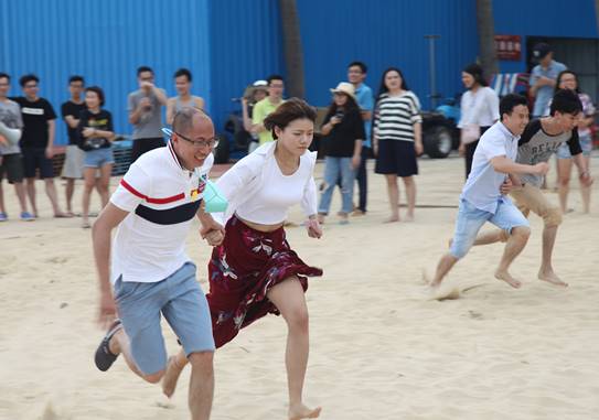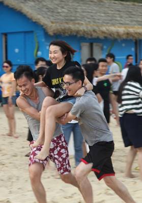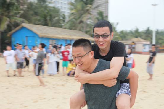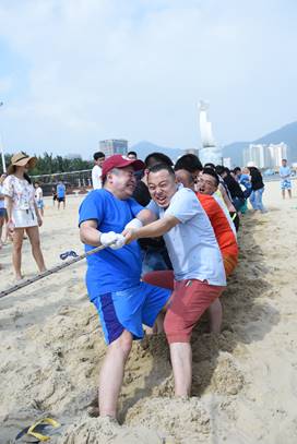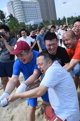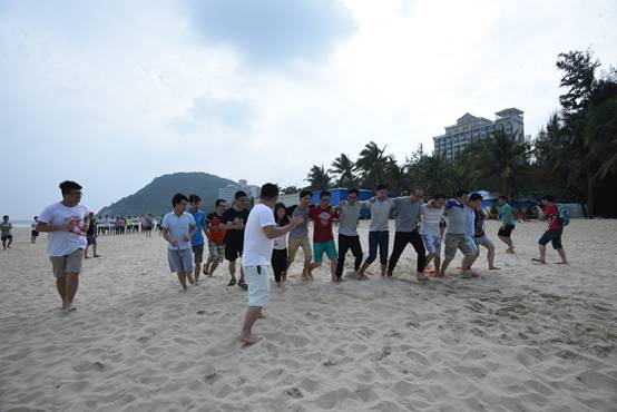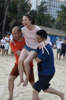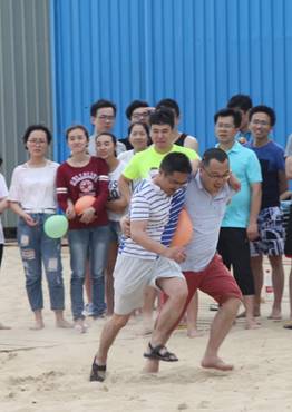 接下來是歡樂的趣味接力活動啦,這一環(huán)節(jié)講究的不僅是速度,隊員的配合也十分重要。雙人夾氣球、背人跑、雙人咬紙巾、抬人跑、轉(zhuǎn)圈跑,大家玩的不亦樂乎,加油聲、呼喊聲、笑聲充斥著整片沙灘!
