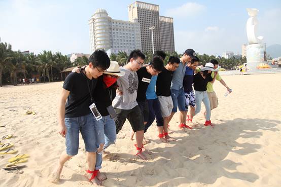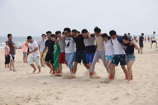 “一二、一二……”,陣陣呼喊聲傳來,拔河之后,考驗?zāi)醯氖耸蛔惚荣愰_始了。隊員們肩并肩,邁著整齊有力的步伐,向著目標(biāo)沖去。盡管腳踝勒出了紅痕,盡管途中有摔倒,但是各組仍奮勇向前,成為海灘上最亮麗的風(fēng)景線。