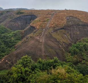 雖然以己經(jīng)是12月份入冬時(shí)節(jié),飛天山景色更似深秋。歷經(jīng)打磨的臺(tái)階,奇特的丹霞地貌,手中的一顆狗尾巴草,雨水浸潤的落葉。