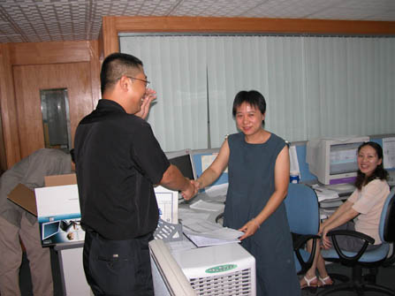 圖中是人事部紀經(jīng)理代表公司總經(jīng)辦將新購買的顯示器親自督促并將移交到有這位準媽媽的部門。