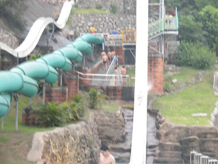 這個項目高是20米,長大概是在70米,從上到下平均分為幾個階梯,玩的時候是人趴在一張造型像滑雪車的泡末板上面向下沖,趴在上面向下沖的時候,會感覺自己像在一條告訴管道上滑行的車,或者是像電視里那個超人一樣,平著身體在空中急速飛翔的感覺,非常的好玩,但唯一個不好的地方就是在急速下沖的時候要注意自己的手肘,因為不注意的話會摩擦到滑道的邊而脫皮,本人就是在這個項目中太過興奮,玩了兩次后,才發(fā)現(xiàn)自己的一塊皮不見了。:)