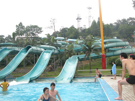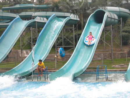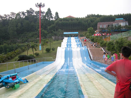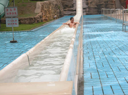 據(jù)不可靠的資料記載,此滑水道有七層樓那么高,也就是大概在25米左右,最高出和接地處據(jù)本人不完全的統(tǒng)計是成110度角,當(dāng)你站到最頂點(diǎn)的高臺上的時候,要往下滑的的時候需具有大智大勇的氣魄; 大智,站在上面的時候,千萬的不要往下看看有多高,不然就肯定把你滑下去的決心減低到百分零點(diǎn)幾。(呵呵,說得有點(diǎn)夸張了,別給我嚇到),大勇,其實就是懵懵懂懂的沖下去,根本就不知道自己干了些什么之類的。