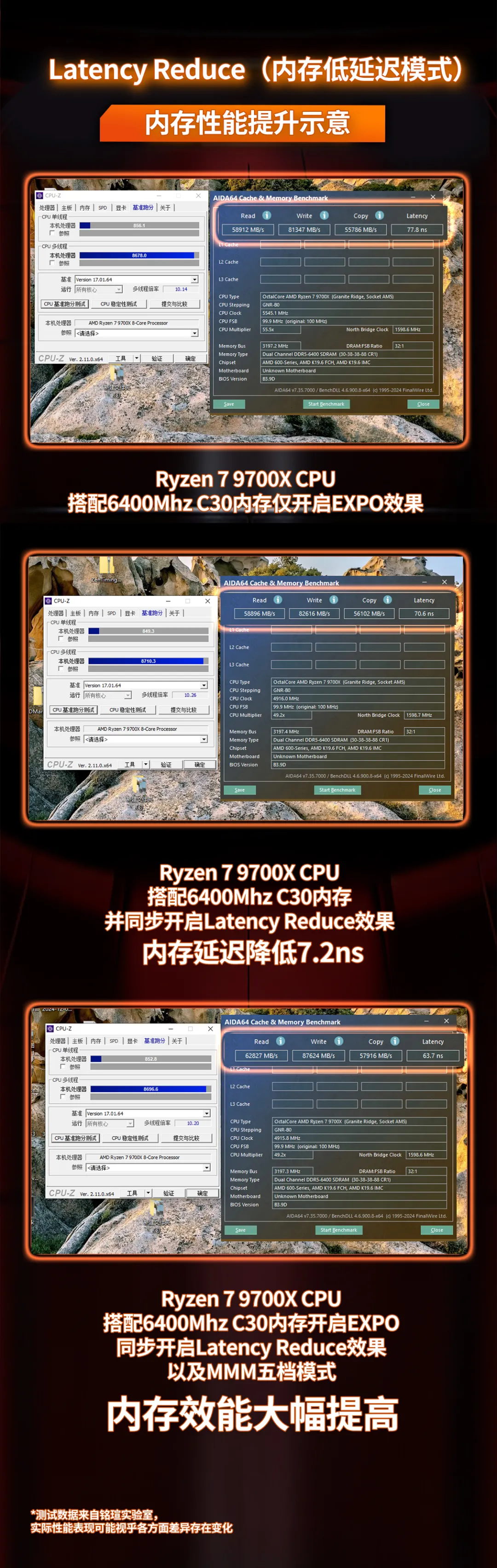 針對Ryzen 9000系CPU內(nèi)存延遲提高,銘瑄專門開發(fā)新功能幫助提升系統(tǒng)效能——Latency Reduce(內(nèi)存低延遲模式)。該功能主要針對內(nèi)存延遲進(jìn)行優(yōu)化,開啟后將進(jìn)一步提升內(nèi)存性能,另外此功能還可搭配MMM銘瑄內(nèi)存大師同時(shí)使用,以達(dá)成更高內(nèi)存效能。