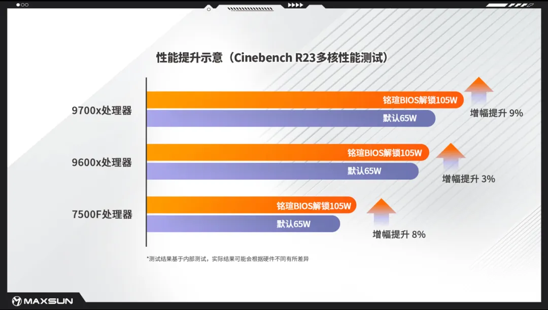 據(jù)銘瑄實(shí)驗(yàn)室實(shí)測顯示,在開啟“65W CPU TURBO TO 105W”模式后,多款A(yù)MD處理器性能皆獲得顯著提升,其中9700X處理器提升最為明顯。