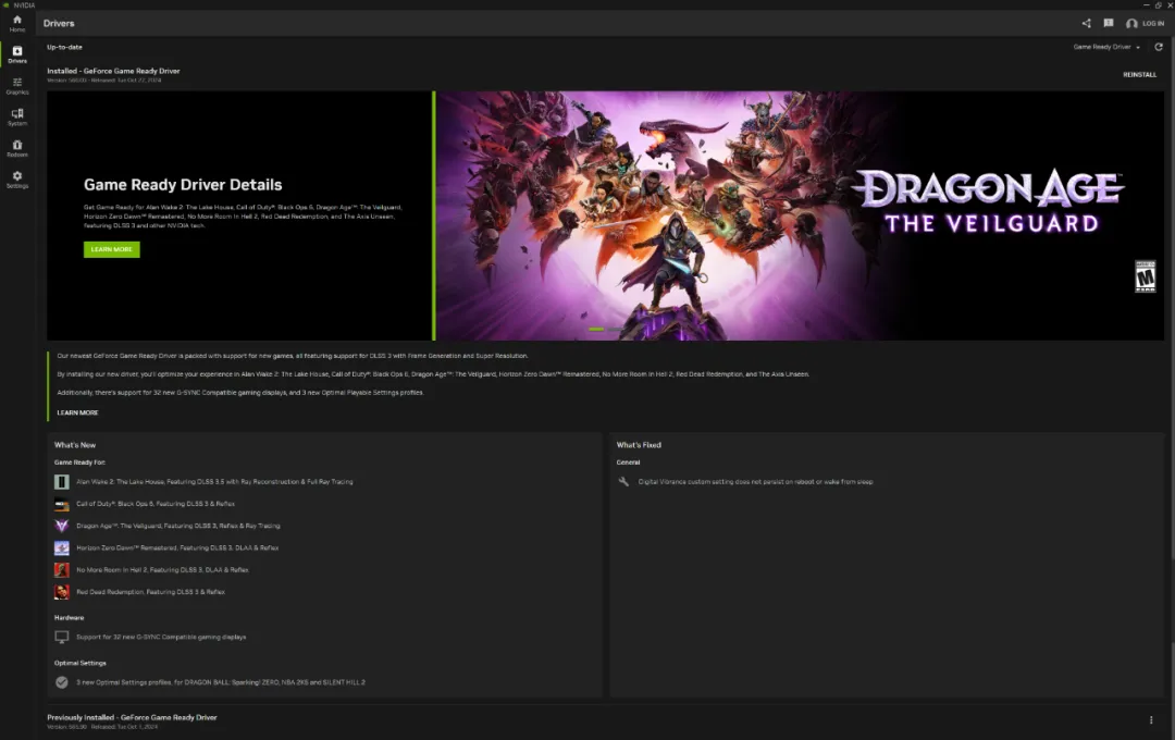 在驅(qū)動程序頁面上,NVIDIA App 進行了優(yōu)化,以要點形式清晰突出新增和改進內(nèi)容,以及支持的游戲列表,方便用戶瀏覽。想要切換 Studio Ready 驅(qū)動或 Game Ready 驅(qū)動的用戶只需點擊屏幕右上角的下拉菜單即可。