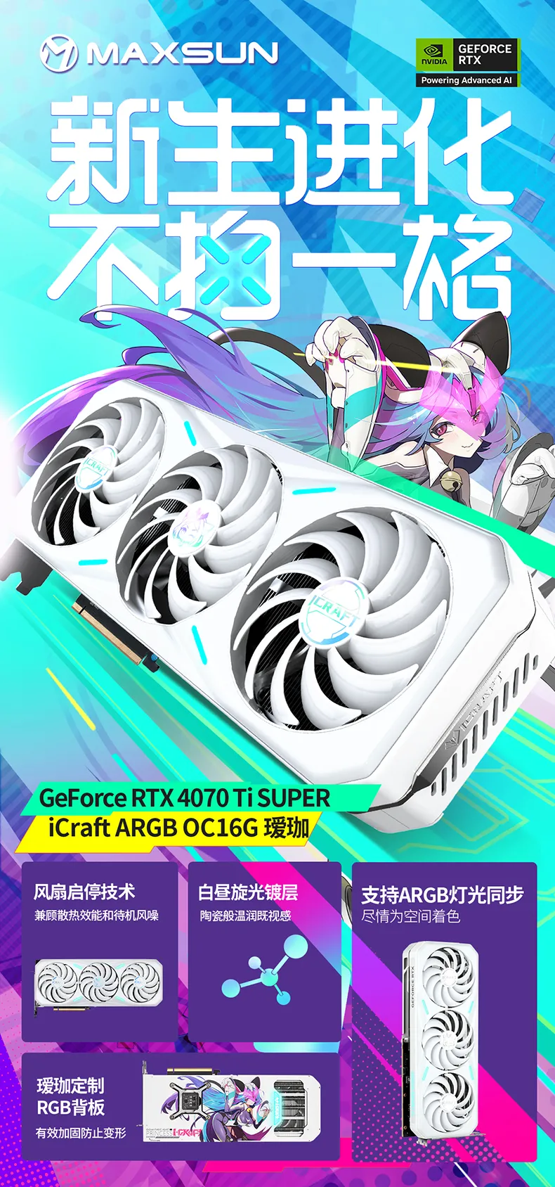 16GB、GDDR6X顯存搭配3風(fēng)扇、8熱管,性能顏值雙出眾,無懼高強度運行,選擇銘瑄GeForce RTX 4070 Ti SUPER iCraft ARGB OC16G 璦珈顯卡作為理想搭檔,與NVIDIA App共同開啟全新的游戲和創(chuàng)作之旅吧!