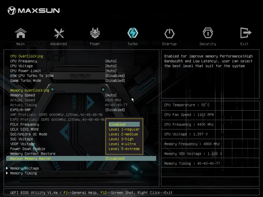 對(duì)于許多用戶而言,內(nèi)存超頻可能仍然是一個(gè)復(fù)雜的話題。銘瑄全新推出MMM模式,幫助用戶快速實(shí)現(xiàn)輕松超頻。針對(duì)不同的用戶需求,MMM模式提供Level 1-5共5個(gè)檔位,預(yù)設(shè)內(nèi)存優(yōu)化配置,用戶直接選擇則可套用。5個(gè)檔位里,檔位越高,性能提升越明顯,但需注意的是同時(shí)對(duì)硬件體質(zhì)要求也更高,用戶可根據(jù)自身實(shí)際情況操作,選擇最適合自身需求的內(nèi)存配置。