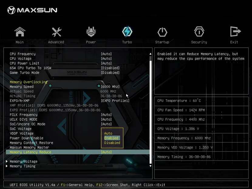 在Turbo頁(yè)面找到Memory Latency Reduce選項(xiàng),選擇Enable/打開(kāi) 后按F10保存,重啟后即可生效。