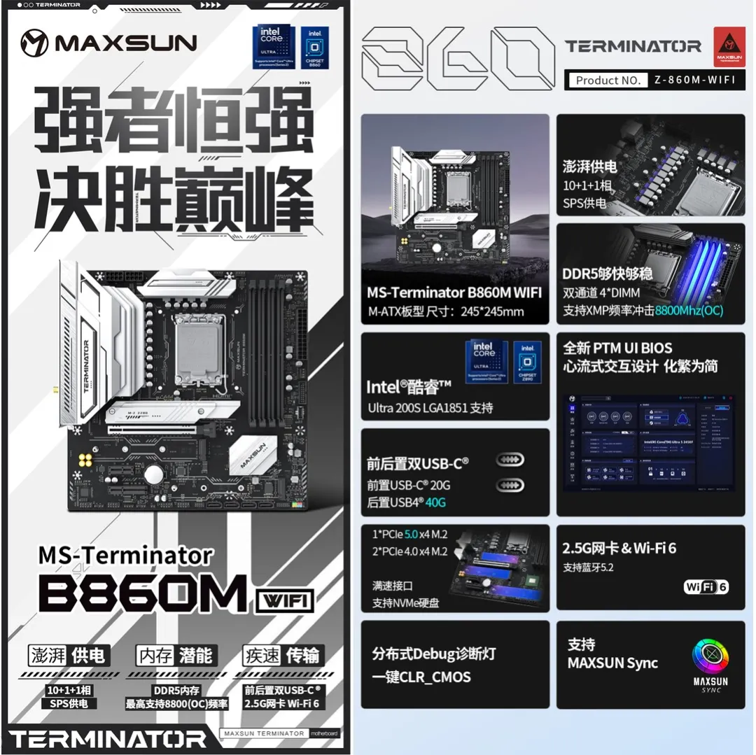Terminator系列首發(fā)的MS-Terminator B860M WIFI 和 MS-Terminator B860M 兩款主板,以 10 + 1 + 1 相 60A SPS 供電設(shè)計(jì)實(shí)現(xiàn)更精準(zhǔn)高效的電源調(diào)控。4 個(gè) DIMM 高速 DDR5 內(nèi)存插槽支持高達(dá) 8800 (OC) 頻率,前后置雙USB-C®接口,輕松連接各類設(shè)備,滿足用戶多元化需求。