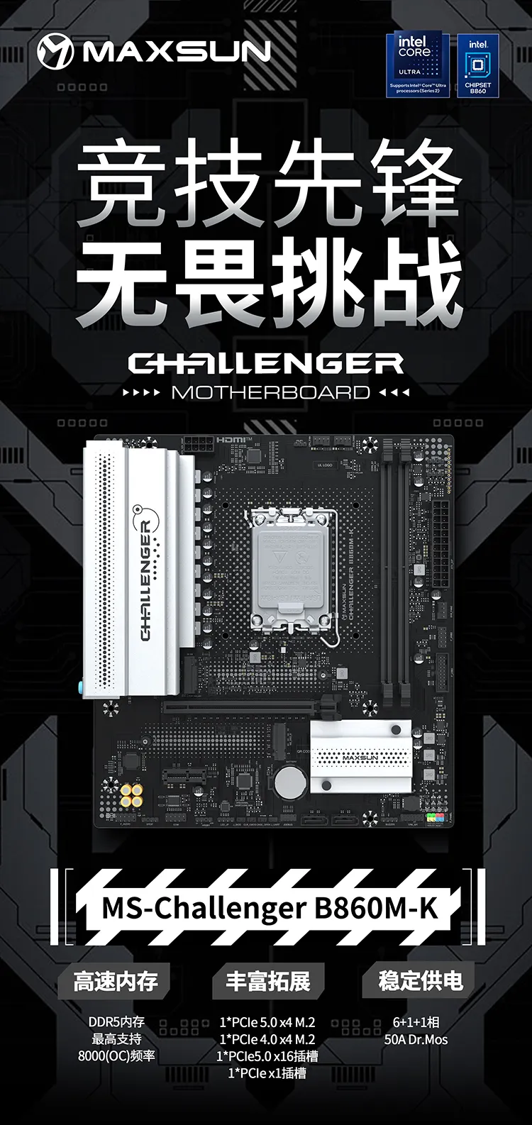 Challenger系列首發(fā)的MS-Challenger B860M-K同樣實(shí)力不凡,6+1+1相50A Dr.Mos穩(wěn)定供電,2*M.2滿速接口,2*PCIe拓展插槽以及多達(dá)10個(gè)USB口,功能多樣且性能可靠。