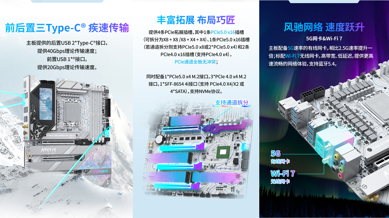 擴(kuò)展方面,提供4條PCle拓展插槽,其中1條PCIe 5.0 x16插槽支持靈活拆分,可根據(jù)需求調(diào)整為X8+X8 或 X8+X4+X4模式,滿(mǎn)足同時(shí)搭載高性能顯卡與PCIe擴(kuò)展卡的需求;板載的SFF-8654 4i接口,可靈活擴(kuò)展為PCIe 4.0 x4通道或4個(gè) SATA 接口,適配多設(shè)備存儲(chǔ)方案。I/O區(qū)域的兩個(gè)40Gbps速率USB4 Type-C 接口,配合DP 1.4與HDMI 2.1視頻接口,輕松滿(mǎn)足多設(shè)備連接需求。