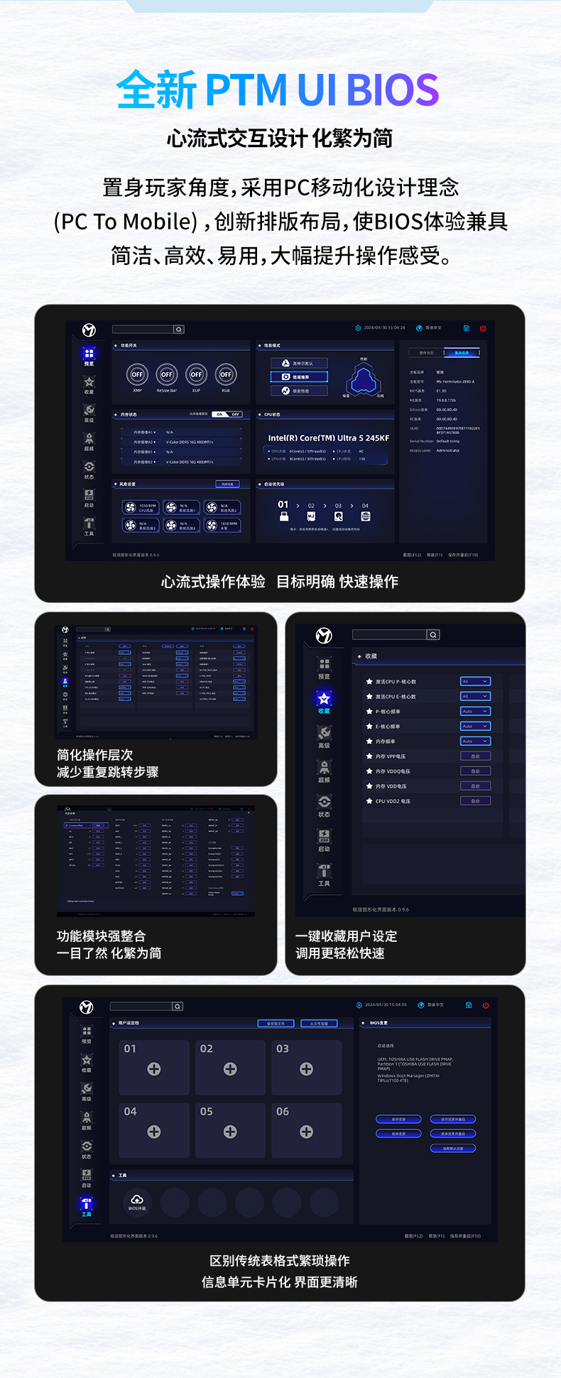 值得一提的是,銘瑄iCraft Z890 Arctic主板的 BIOS 界面經(jīng)過(guò)全面升級(jí),采用了 PTM UI BIOS。全新的 PTM UI BIOS 借鑒手機(jī) APP 的交互邏輯,秉持 PTM 設(shè)計(jì)理念(PC To Mobile)。它先將所有功能模塊化,再進(jìn)行聚焦式設(shè)計(jì),讓所有交互層級(jí)不超過(guò) 2 層。手機(jī)端風(fēng)格的卡片式體驗(yàn)界面,更符合現(xiàn)今用戶(hù)的使用習(xí)慣,讓復(fù)雜的 BIOS 設(shè)置變得高效、簡(jiǎn)單、易用,即使是新手也能輕松上手。