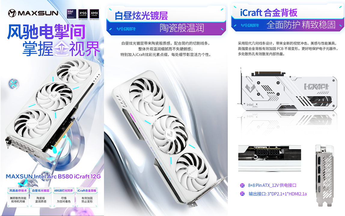如果說(shuō)主板是戰(zhàn)場(chǎng)“調(diào)度中心”,那MAXSUN Intel Arc B580 iCraft 12G顯卡就是還原《戰(zhàn)地6》戰(zhàn)場(chǎng)質(zhì)感的“光影畫(huà)師”,而且還是位“顏值派畫(huà)師”。 白晝炫光白涂層覆蓋的顯卡主體,搭配簡(jiǎn)約幾何線(xiàn)條修飾的合金背板,與Z890 Arctic主板放在一起堪稱(chēng)“白月光組合”,顏值拉滿(mǎn)。