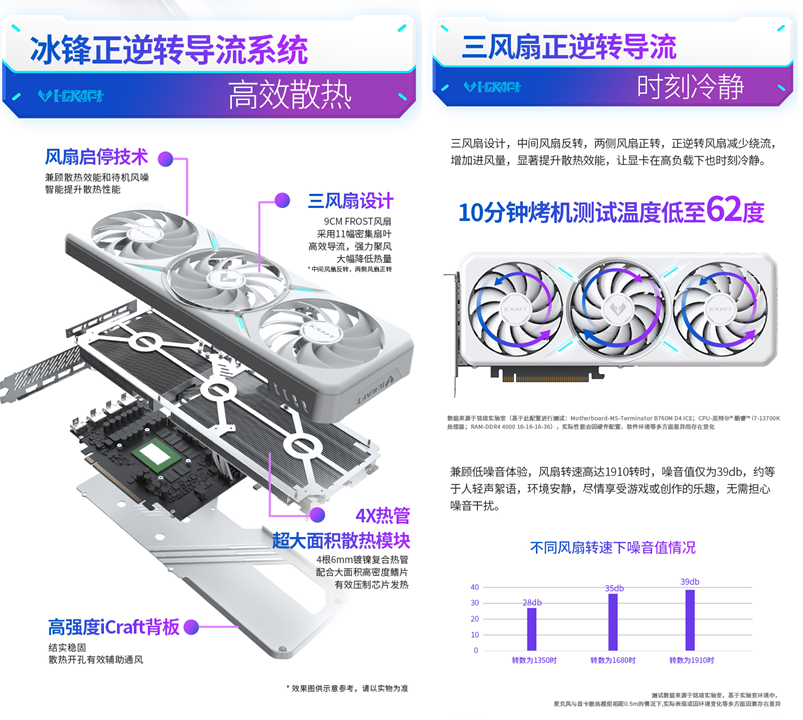針對(duì)《戰(zhàn)地6》長(zhǎng)時(shí)間團(tuán)戰(zhàn)的高負(fù)載場(chǎng)景,這款顯卡采用創(chuàng)新的正逆轉(zhuǎn)導(dǎo)流散熱系統(tǒng),三風(fēng)扇相鄰旋轉(zhuǎn)方向不同,顯著減少氣流干擾并提升進(jìn)風(fēng)效率,讓溫度更低,噪音控制表現(xiàn)更好。在10分鐘Time Spy烤機(jī)測(cè)試中,MAXSUN Intel Arc B580 iCraft 12G顯卡溫度僅為62℃,以游刃有余的冷靜表現(xiàn),守護(hù)每一分性能的穩(wěn)定輸出。