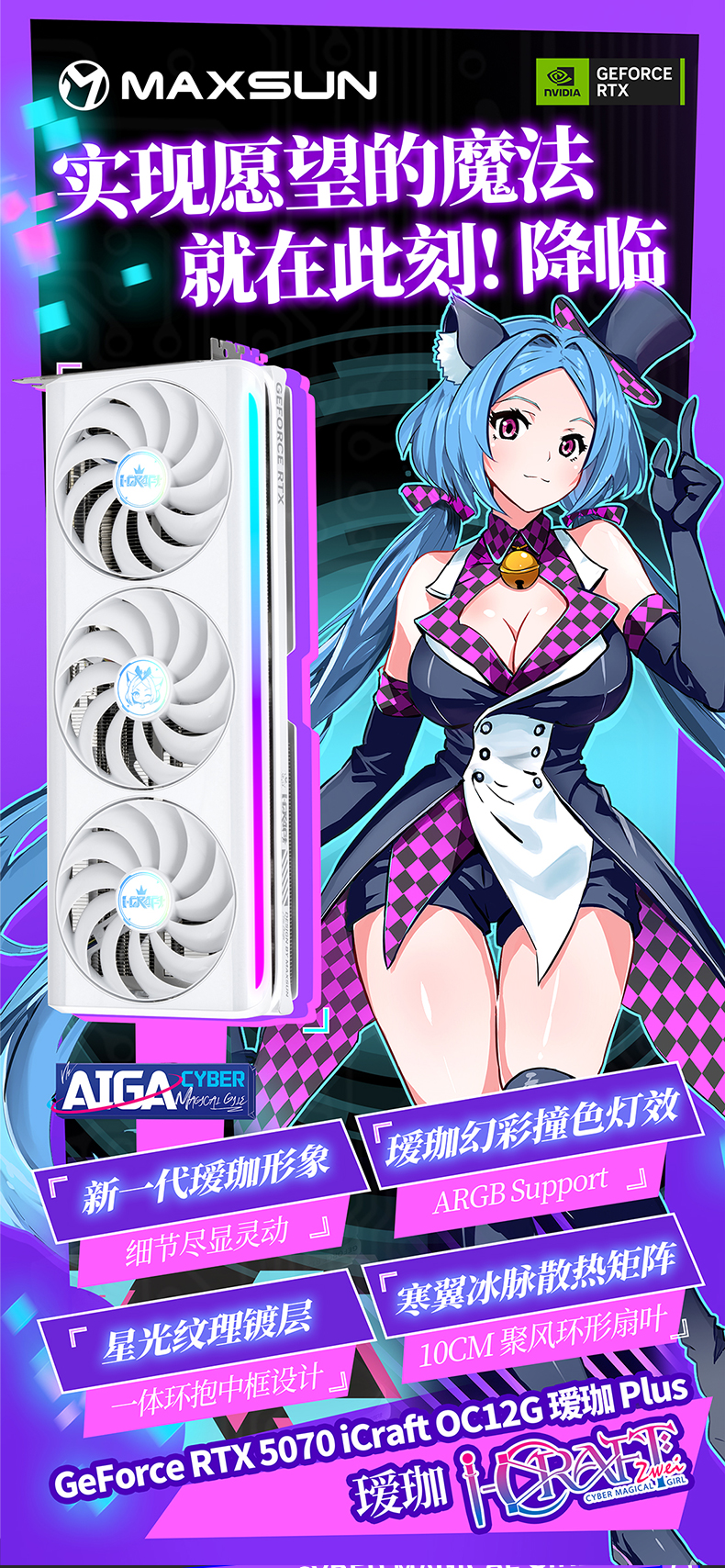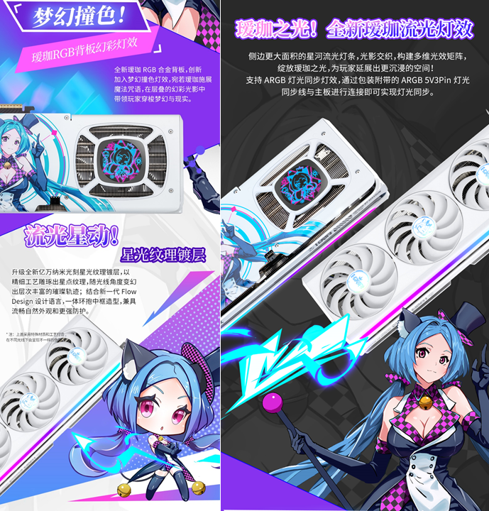 銘瑄GeForce RTX 5070 iCraft OC12G 璦珈,這款顯卡外觀上延續(xù)溫潤質(zhì)感的設(shè)計(jì)基調(diào),升級(jí)ARGB燈光同步燈效,側(cè)邊創(chuàng)新加入星河流光燈條,燈光流轉(zhuǎn)間如同賽博世界的魔法光芒,靈動(dòng)又吸睛。高強(qiáng)度合金背板不僅提供穩(wěn)固防護(hù),更搭載 Q 版璦珈燈效,萌力與科技感完美融合,讓顯卡靜置時(shí)也成為桌面一道亮眼風(fēng)景。