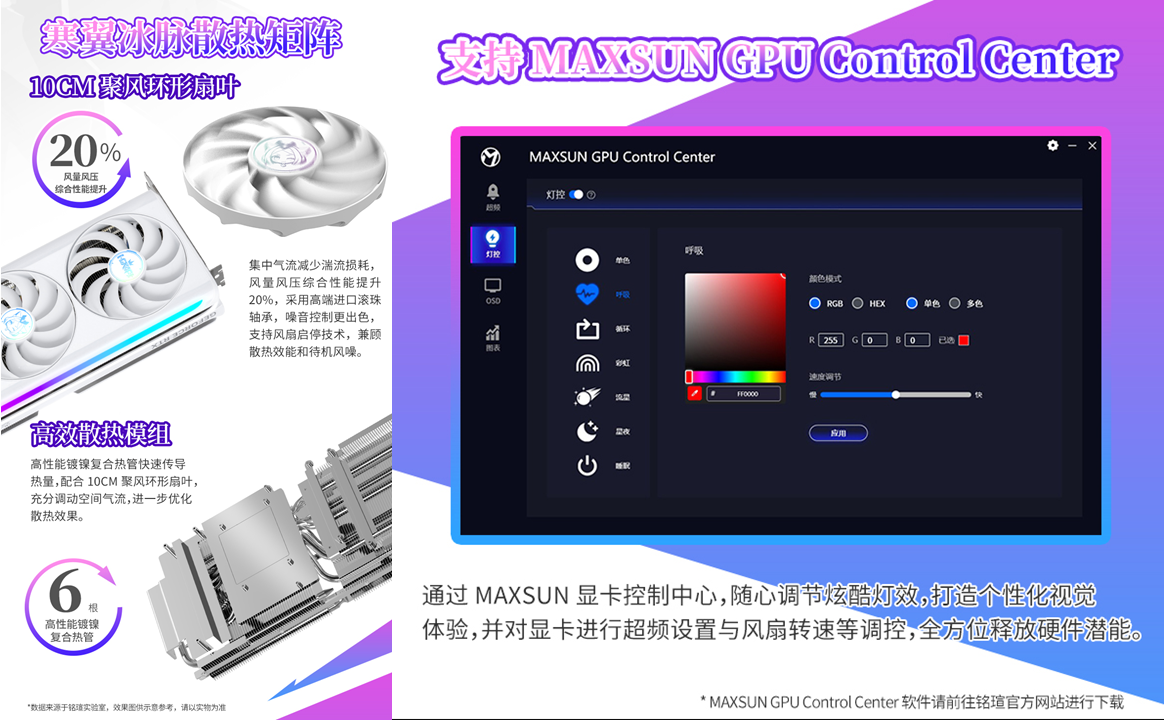 散熱方面,這款顯卡同樣性能在線。3個(gè)10CM聚風(fēng)環(huán)形扇葉搭配進(jìn)口高端滾珠軸承,能集中氣流減少湍流損耗,風(fēng)量風(fēng)壓綜合性能提升20%。配合高效鍍鎳復(fù)合熱管與大面積高密度鰭片,大幅降低接觸熱阻,熱量可迅速導(dǎo)出并高效散發(fā)。同時(shí)支持風(fēng)扇啟停技術(shù),兼顧散熱效能與待機(jī)靜音體驗(yàn)。此外,該卡還支持MAXSUN GPU Control Center軟件,玩家可輕松調(diào)節(jié)個(gè)性化燈效、進(jìn)行超頻設(shè)置與風(fēng)扇轉(zhuǎn)速調(diào)控,全方位釋放顯卡潛能。