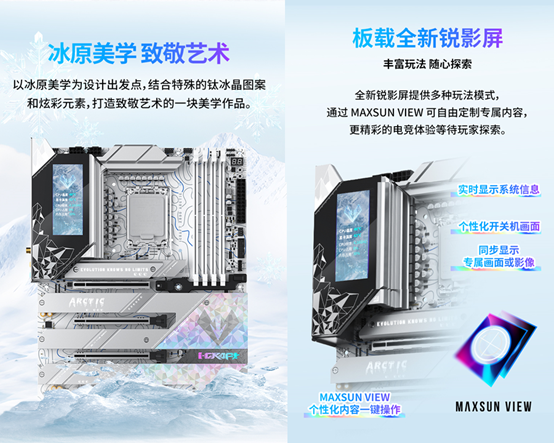 首先是銘瑄 iCraft Z890 Arctic主板,作為iCraft系列的高端型號(hào),以 “北冰洋” 為設(shè)計(jì)靈感,采用冰原美學(xué)設(shè)計(jì)。特殊的鈦冰晶圖案搭配炫彩元素,整體色調(diào)統(tǒng)一且富有質(zhì)感,擺在機(jī)箱中宛如一件冰雕藝術(shù)品,完美適配當(dāng)下流行的白色主機(jī)風(fēng)格,與《戰(zhàn)地 6》的冰雪戰(zhàn)場(chǎng)形成奇妙呼應(yīng)。板載的全新銳影LED屏,不僅支持RGB光效同步,還能實(shí)時(shí)顯示CPU溫度、內(nèi)存頻率、供電狀態(tài)等核心參數(shù),更有多種玩法模式可選。這讓你在激戰(zhàn)《戰(zhàn)地 6》時(shí),無需頻繁切換監(jiān)控軟件打斷游戲,就能直觀掌握硬件運(yùn)行情況,實(shí)用性與觀賞性拉滿。
