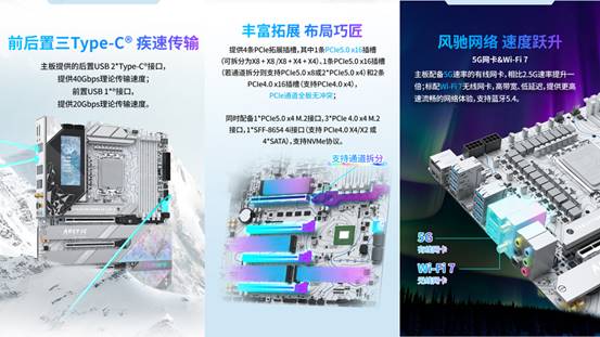 擴(kuò)展方面,該主板提供4條PCle拓展插槽,其中1條PCIe 5.0 x16插槽支持靈活拆分,可根據(jù)需求調(diào)整為X8+X8 或 X8+X4+X4模式,滿足同時(shí)搭載高性能顯卡與PCIe擴(kuò)展卡的需求;板載的SFF-8654 4i接口,可靈活擴(kuò)展為PCIe 4.0 x4通道或4個(gè) SATA 接口,適配多設(shè)備存儲(chǔ)方案。I/O區(qū)域的兩個(gè)40Gbps速率USB4 Type-C 接口,配合DP 1.4與HDMI 2.1視頻接口,輕松滿足多設(shè)備連接需求。網(wǎng)絡(luò)體驗(yàn)同樣無需擔(dān)憂。它搭載 Intel BE200 無線網(wǎng)卡與 Realtek RTL8126 有線網(wǎng)卡,支持 Wi-Fi 7 與 5G 有線網(wǎng)絡(luò),還具備藍(lán)牙 5.4 功能。無論是在復(fù)雜網(wǎng)絡(luò)環(huán)境下進(jìn)行 128 人聯(lián)機(jī)對(duì)戰(zhàn),還是連接無線外設(shè),都能實(shí)現(xiàn)低延遲、高穩(wěn)定的傳輸,讓你避免因網(wǎng)絡(luò)波動(dòng)錯(cuò)失戰(zhàn)機(jī)。