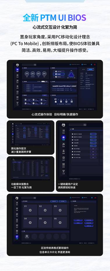 值得一提的是,銘瑄iCraft Z890 Arctic主板的 BIOS 界面經(jīng)過全面升級(jí),采用了 PTM UI BIOS。全新的 PTM UI BIOS 借鑒手機(jī) APP 的交互邏輯,秉持 PTM 設(shè)計(jì)理念(PC To Mobile)。它先將所有功能模塊化,再進(jìn)行聚焦式設(shè)計(jì),讓所有交互層級(jí)不超過 2 層。手機(jī)端風(fēng)格的卡片式體驗(yàn)界面,更符合現(xiàn)今用戶的使用習(xí)慣,讓復(fù)雜的 BIOS 設(shè)置變得高效、簡單、易用,即使是新手也能輕松上手。