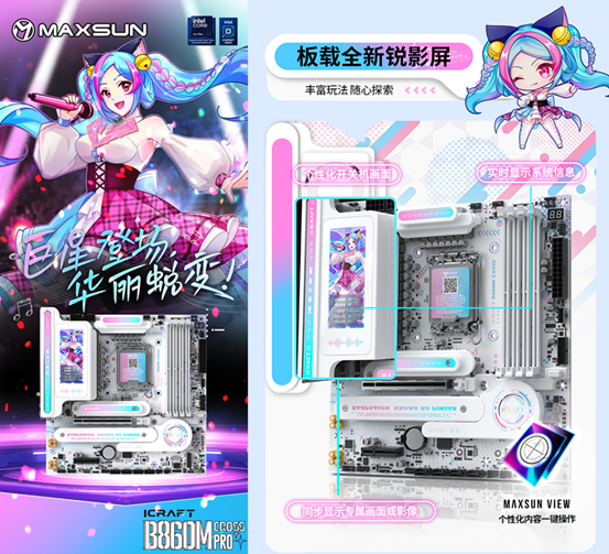 然后是銘瑄iCraft B860M CROSS PRO主板,作為顏值旗艦,全覆蓋著藍(lán)粉漸變的二次元紋路,每一處細(xì)節(jié)都透著精致感。吸睛亮點(diǎn)莫過于全新配備的3.4英寸銳影LED顯示屏,不僅能實(shí)時(shí)顯示CPU溫度、內(nèi)存頻率等系統(tǒng)信息,還能自定義開關(guān)機(jī)畫面,甚至支持桌面映射,同步展示專屬壁紙或游戲畫面。搭配配套軟件MAXSUN View,玩家可以盡情解鎖無限自定義玩法,讓主板成為主機(jī)的 “個(gè)性門面”。
