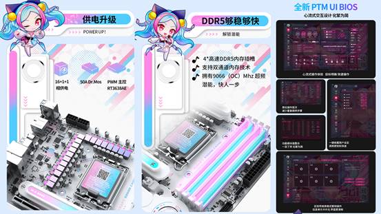 性能上這款主板同樣毫不妥協(xié)。16+1+1 相供電設(shè)計(jì)搭配核心供電 50A Dr.Mos,強(qiáng)悍的供電能力足以輕松駕馭英特爾酷睿Ultra 200S系列處理器的性能,即便在《戰(zhàn)地 6》滿負(fù)載運(yùn)行時(shí),也能保持穩(wěn)定輸出,避免因供電不足導(dǎo)致的卡頓、掉幀。4 條雙通道DIMM的DDR5內(nèi)存插槽經(jīng)過優(yōu)化線路布局,擁有 9066(OC)Mhz 的超頻潛能,玩家只需通過銘瑄 PTM UI 圖形化 BIOS,幾步簡單操作就能調(diào)整供電參數(shù)、拉滿內(nèi)存頻率,輕松為《戰(zhàn)地6》優(yōu)化整機(jī)性能,小白也能輕松上手。