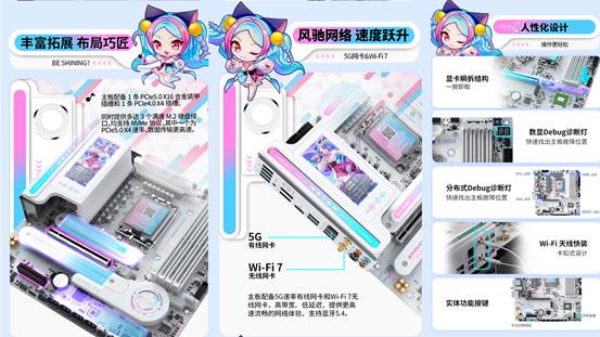 拓展性與網(wǎng)絡(luò)體驗(yàn)更是直擊玩家需求。該1條PCIe5.0 X16合金裝甲插槽+1條 PCIe4.0 X4 插槽,搭配3個(gè)滿速M(fèi).2硬盤接口和 4個(gè)6G SATA接口,無論是加裝高速固態(tài)硬盤還是拓展其他硬件,都能從容應(yīng)對(duì)。多人對(duì)戰(zhàn)時(shí)就怕網(wǎng)絡(luò)卡頓,這款主板搭載英特爾BE200無線網(wǎng)卡,支持Wi-Fi 7 和藍(lán)牙5.4,再加上5G有線網(wǎng)口的雙旗艦網(wǎng)絡(luò)配置,傳輸速度又快又穩(wěn),讓你在《戰(zhàn)地6》的百人對(duì)戰(zhàn)中告別延遲,快速響應(yīng)每一次戰(zhàn)術(shù)指令。更貼心的是,顯卡瞬拆結(jié)構(gòu)和 Wi-Fi天線快裝設(shè)計(jì)讓裝機(jī)、升級(jí)更便捷,數(shù)顯+分布式 Debug 診斷燈能一眼識(shí)別故障位置,省去繁瑣排查步驟,讓玩家專注享受裝機(jī)與游戲的樂趣。