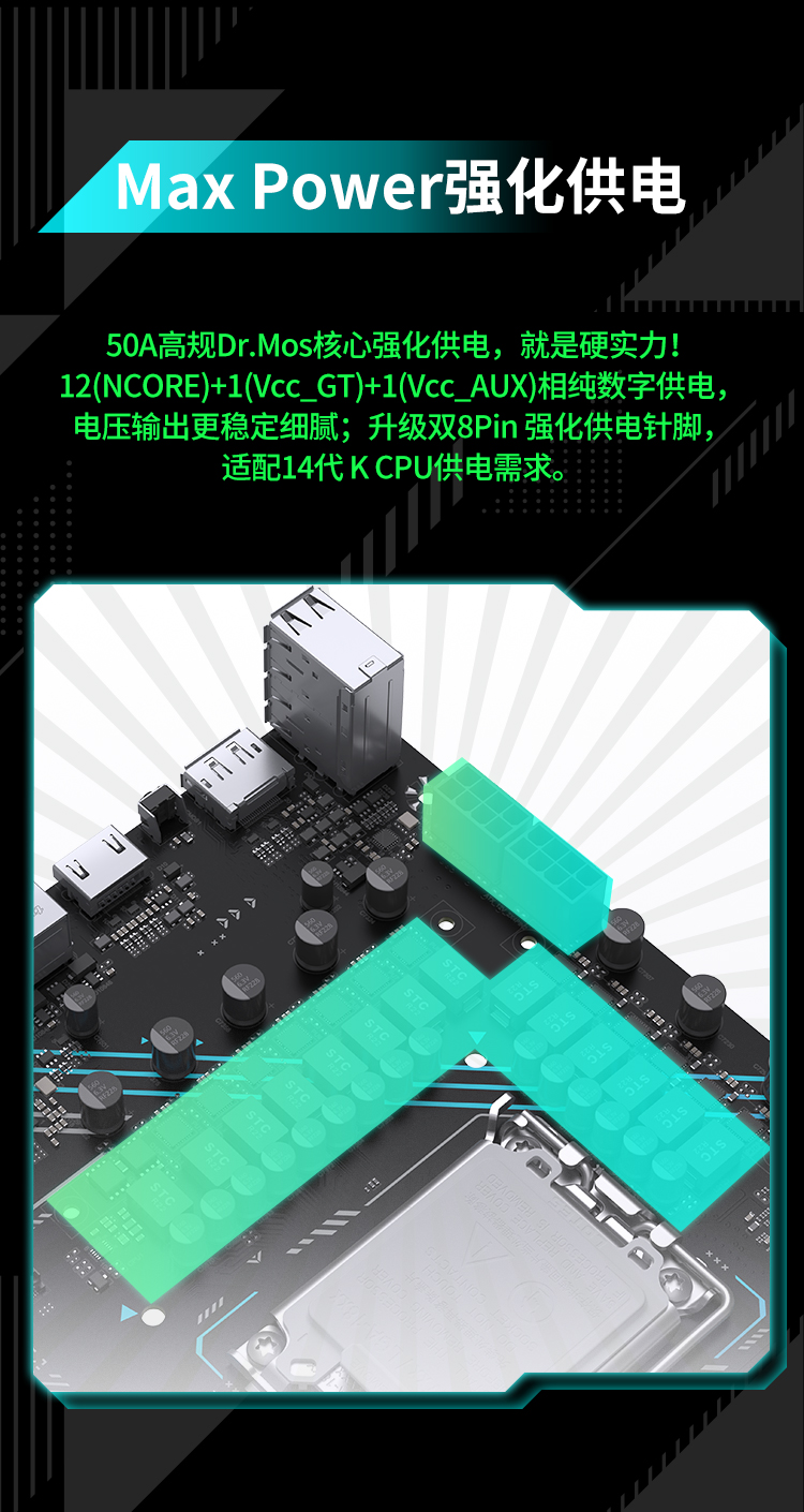 銘瑄B760M GAMING WIFI ACE D4 II主板,供電方面采用了12+1+1相純數(shù)字供電設(shè)計(jì),配合50A高規(guī)Dr.Mos核心,能實(shí)現(xiàn)更穩(wěn)定細(xì)膩的電壓輸出,為處理器提供穩(wěn)定的強(qiáng)勁動(dòng)力。同時(shí),主板升級(jí)雙 8Pin CPU 供電接口,進(jìn)一步強(qiáng)化供電穩(wěn)定性,即便處理器處于高負(fù)載運(yùn)行狀態(tài),也能從容應(yīng)對(duì)。搭配大面積銀霜白合金散熱裝甲,高效驅(qū)散供電模塊產(chǎn)生的熱量,避免因高溫導(dǎo)致的卡頓、重啟等問題,讓每一次游戲激戰(zhàn)都流暢到底。