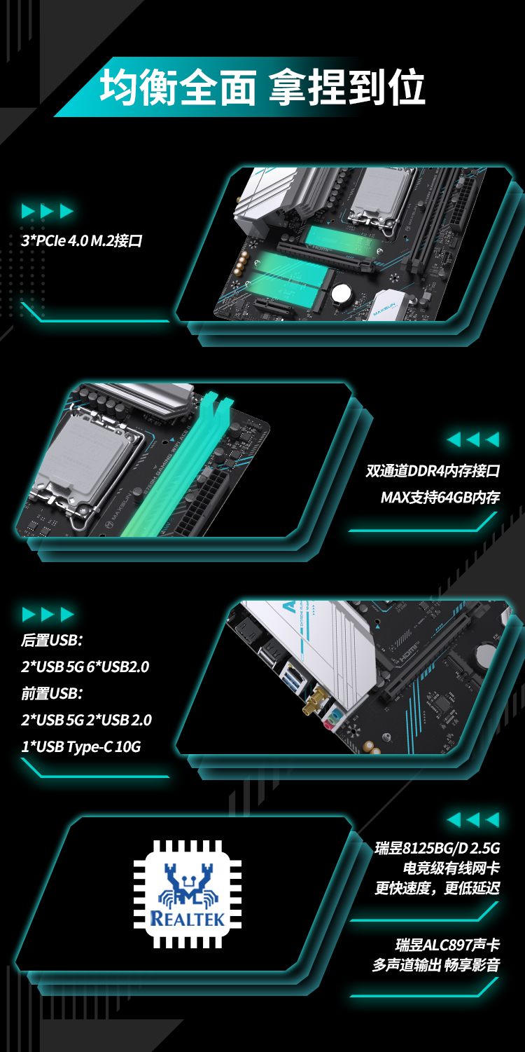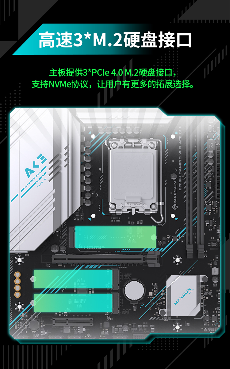 內(nèi)存方面,銘瑄 B760M GAMING WIFI ACE D4 II 主板搭載2條DDR4內(nèi)存插槽,最高支持64GB大容量,擁有3600MHz(OC)的超頻潛能,能充分釋放14代處理器的性能潛力,為3A游戲幀率提升、多任務(wù)處理提速提供強(qiáng)勁支撐。存儲(chǔ)方面,主板支持高速3*M.2硬盤接口,支持PCIe 4.0 X4通道NVMe協(xié)議,玩家可以自由選擇和擴(kuò)展存儲(chǔ)設(shè)備,輕松提升系統(tǒng)性能,加載大型游戲也毫無壓力。