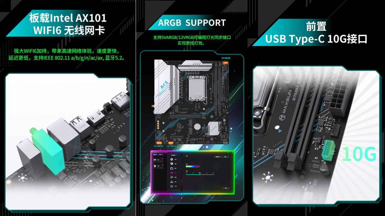 接口配置更是貼心又全面,后置IO接口豐富多樣,涵蓋 DP 1.2、HDMI 1.4 視頻接口,輕松支持 4K 高清輸出,滿足影音娛樂需求;同時(shí)配備 2 個(gè) USB 5G 接口、6 個(gè) USB 2.0 接口,足以連接鍵盤、鼠標(biāo)、硬盤等各類外設(shè)。更值得一提的是,主板貼心配備背部 CMOS 一鍵重置按鈕,無需開蓋即可快速恢復(fù) BIOS 設(shè)置,輕松解決超頻失誤等突發(fā)問題;分布式 DEBUG 燈則能幫助用戶快速定位主板故障,排查問題更高效。前置接口同樣給力,提供 10Gbps 速率 Type-C 接口與 5Gbps USB 接口,適配高速外設(shè)接入;支持 5V ARGB/12V RGB 可編程燈光同步接口,搭配 MAXSUN SYNC 燈控軟件,玩家可自由打造個(gè)性化光效主機(jī),讓顏值與性能并存。