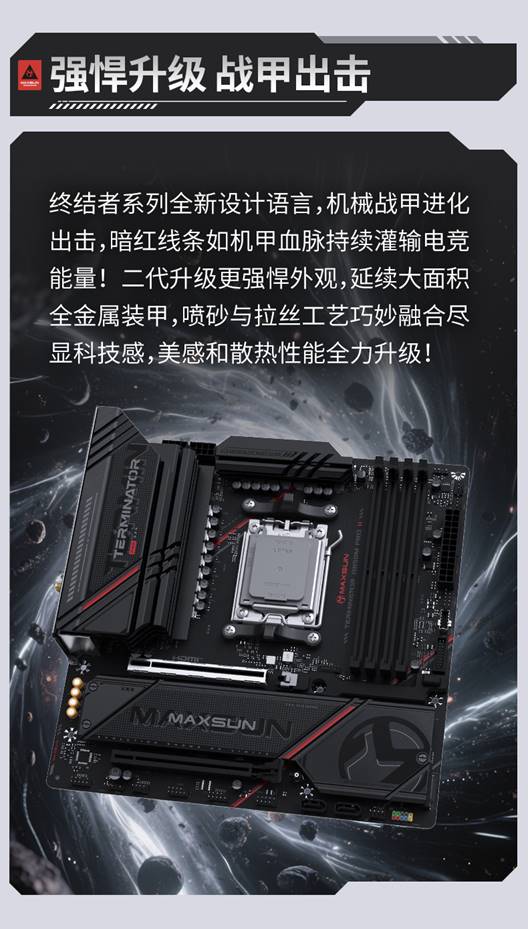 終結(jié)者系列全新設(shè)計語言再度突破,機械戰(zhàn)甲外觀進化出擊,二代升級更強悍外觀,暗紅線條如機甲能量脈絡(luò)貫穿散熱裝甲,大面積全金屬裝甲,噴砂與拉絲工藝巧妙融合,進一步提升視覺科技感與整體質(zhì)感。